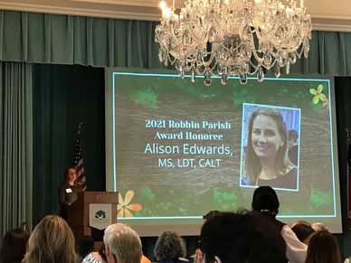 Alison Edwards was the 2021 recipient of the Robbin Parish Award for her commitment to lifelong learning and children who have communication delays and learning differences.